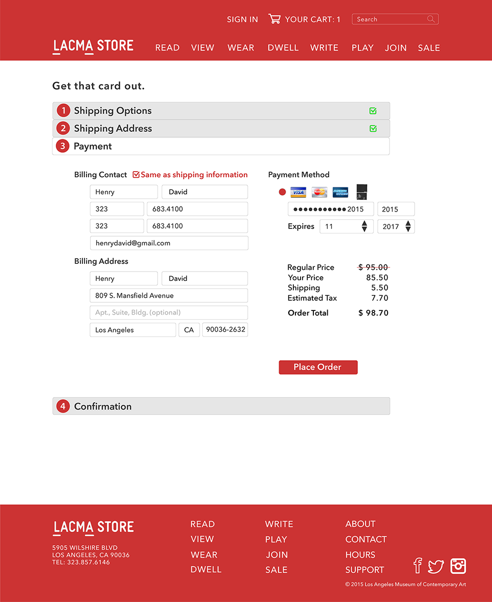 One of the primary business goals of the LACMA online store is to support the museum with additional revenue. However, there were some serious usability challenges that were preventing users from finding merchandise and completing online transactions. A thoughtful and thorough redesign of this e-commerce site was necessary to enhance usability and to service the business goal of increasing online sales revenue.