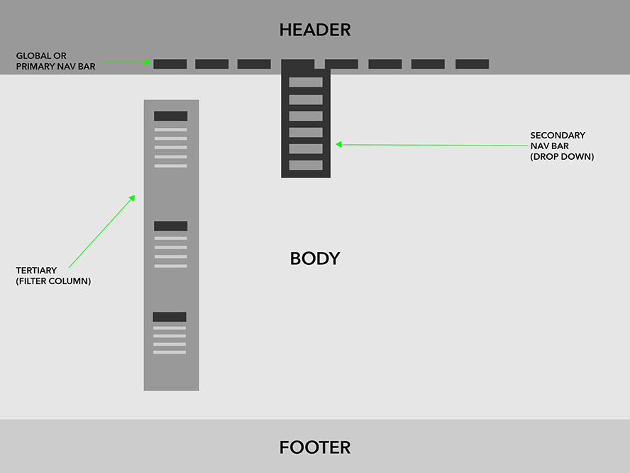 After taking a complete inventory, and beginning to find affinities between the items, it was common verbs, rather than nouns, which seemed to provide the best solution. This solution was also efficient in that it helped trim the number of categories to eight within the navigation bar.